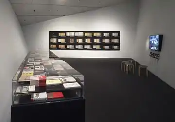 Xie's work in other media share the conceptual preoccupations of his paintings.[20][46] Several early installations (1994–9) addressed historical events involving censorship—the 20th-century student movements in China, the burning of books by the Nazis, the destruction of books by China's Red Guards.[20][47] He returned to that theme in the installation Rhythm of Time, Corridor of Memory (2010) and in the Denver Art Museum (DAM) and Asia Society shows, "Eyes On: Xiaoze Xie" (2017) and "Objects of Evidence" (2019).[11][48] The two shows investigated the history of book banning in China, revealing its ideological shifts by highlighting what different regimes made invisible.[36][48] They featured paintings, an installation of glass cases holding nearly three hundred banned books that Xie collected (Objects of Evidence, which compared first and second editions for censorship), life-size, mug-shot-like photographs of yellowing premodern books, and a documentary of Xie's research, Tracing Forbidden Memories.[36][11][10] Critic Barbara Pollack described the latter show's effect as "a mournful combination of awe and sadness."[48]