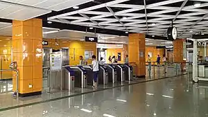 Xichang Station (Chinese: 西场站), formerly Dongfeng Road West Station (东风西路站) during planning,[1][2] is a station on Line 5 of the Guangzhou Metro.[3] It is located under the junction of Huanshi Road West (环市西路) and Dongfeng Road West (东风西路) in the Liwan District of Guangzhou. Huanshi Road West is the main shopping area for shoes in the city.[4][5] The station opened on 28 December 2009.[6]