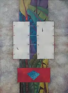 Ximena Armas's works hide secrets. Nothing is revealed; all is instead veiled with ribbons and bands, hemmed with curtains, burrowed beneath a mass of stones. She fringes all her paintings with mystery, dresses them with shades. One is struck at once by their odd composition, made of striped bands, ruffled feathers, or beach huts. Her figures hide or suddenly appear as shadows or silhouettes. The artist plays at staging over and over again the familiar elements of her dreamlike world, thus totally mastering space and swamping it with symbols.