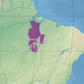 The Xingu–Tocantins–Araguaia moist forests ecoregion has an area of 26,625,077 hectares (65,792,000 acres). It lies to the south of the Amazon River in eastern Brazil.[1] The Xingu River defines the western boundary and the Tocantins River defines the eastern boundary. To the south the ecoregion rises into the Carajás Mountains, where it becomes interspersed with areas of seasonal forest and cerrado. Population centers include São Félix do Xingu on the Xingu, Porto de Moz, Oeiras do Pará and Gurupá on the Amazon, and Marabá on the Tocantins.[2]