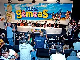 2006 was a year of celebration in Xuxa's career. Completing 20 years on Globo TV, For this, the project to make a film with "two Xuxas" was resumed, but this time, without the international character.[7][8] On May 4, 2006, Xuxa went to TV show Domingão do Faustão to relanse several projects: the DVD "Xuxa, o Show ao Vivo" and the project of the movie Gêmeas.[9][10] The TV hosts reported that there would be a contest, designed by Jayme Praça, director of Domingão, and by the production of Xuxa, to choose a lookalike of the artist.[6] The candidates needed to be between 18 and 35 years old and the winner would have the intention of assisting the filming, especially in the scenes in which the twin sisters counter.[11][12][13] Subsequently, while the inscriptions were open, the contest was publicized daily by TV Xuxa and Xuxa's Sunday column in the newspaper EXTRA.[14] The contest was held on August 27, 2006 and the winner was the tourist Isabele Fintelman.[15] With a budget of R$5.2 million reais, Gêmeas came from a questioning of the director Jorge Fernando "What I would propose different Xuxa?, What she never did? A villain. How to reconcile Xuxa image with the a villain? The twins have appeared" he explains. Xuxa's advisory adds - Jorge is making the star represent and this is unheard of for her.[16] Xuxa commented on the challenge of interpreting an antagonist: