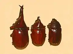 Xylotrupes gideon can reach a length of 3.5–7 centimetres (1.4–2.8 in).[7] As usual with rhinoceros beetles there is a great difference between the genders. Males are larger than females. They have two chitinous bifurcated horns, a thick thoracic horn and a smaller cephalic horn, which they use to eliminate their rivals during the mating period.[7] These beetles are shiny dark red, dark brown, or black in coloration. The eyes are located on each side of the head. When disturbed these beetles make a hissing noise, produced by rubbing the tip of the abdomen against the edge the elytra.[8][9]
