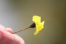 Xyris operculata (A) can be differentiated from Xyris marginata (B) by its slender and erect leaves, as opposed to the spring-like leaves of Xyris marginata. In addition, Xyris operculata has three stamens reduced to hairy tufts in addition to its three regular stamens.[6] Xyris muelleri (C) has leaves curling upwards, which are pointed at the ends. The petals have consistent margins. Xyris tasmanica (D) has consistent margins similar to C, however, does not have leaves close to the head of the flower.