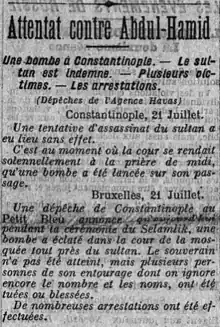 A failed assassination attempted on Sultan Abdul Hamid II by the Armenian Revolutionary Federation (ARF) at Yıldız Mosque took place on 21 July 1905 in the Ottoman capital Istanbul.[1] The Times described the incident as "one of the greatest and most sensational political conspiracies of modern times."[1]