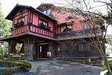 • Bangaro was designed by Teiji Suzuki for Itō Suketami as his cottage. Upstairs it has a Japanese tea ceremony room that was originally from the Tokugawa lords of the Owari Domain. The checkerboard pattern on the wall is called ichimazu and can also be found on the brick chimney outside. The building is a blend of Japanese and western architecture.[1]