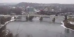 ![]() The Zanesville Y-Bridge, seen from a high bluff south of the river confluence. | |