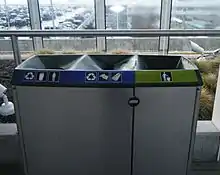 YVR has 450 recycling containers evenly distributed and located around its terminals, divided for recycling plastic and paper. The containers themselves are made from recycled aluminum, steel and plastic and help recycle over 1,250,000 kg of material each year.[20]