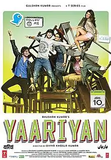 Yaariyan (transl. Friendships) is a 2014 Indian Hindi-language coming-of-age romance film directed by Divya Khosla Kumar,[3] and stars Himansh Kohli, Rakul Preet Singh and Nicole Faria.[4] It marked the Hindi debut of the director[5] as well as the leads. The film was produced by Bhushan Kumar and Krishan Kumar under the banner of T-Series Super Cassettes Industries. The response to the promotional material on YouTube led the distributor to release the film two weeks earlier than initially planned.[6] The film released on 10 January 2014 with 1200 screens release in India.[7] The film received negative review from critics but was a box office success grossing ₹550 million against its ₹100 millions budget.