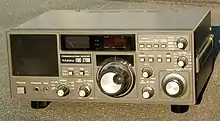 - FRG-7700 (HF communications receiver) – An HF receiver for the radio amateur and for the commercial market. It is a metal-cased receiver with a polymer front and it is suitable for reception in the AM, FM, CW and SSB modes. Its frequency coverage is from 150 kHz – 30.0 MHz continuously in 30 switchable band segments. Its frequency readout is available in a traditional analog (dish) mode as well as in a digital display mode.[6] Called a “budget receiver”, the FRG-7700 was released in 1978 as successor to the FRG-7000 and priced at approximately US$450. This type was in production until 1982.[7] The FRG-7700 is a superheterodyne type receiver going up to 48 MHz in the Intermediate Frequency trap, followed by a fully synthesized local oscillator in the 1st and 2nd mixer unit and thus creating a VFO that is reasonably stable after warm-up.[8][9]