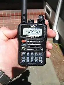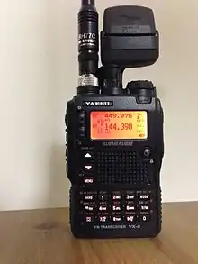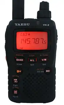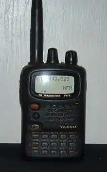 The Yaesu VX-1R is a micro-miniature multiband FM transceiver with extensive receiver frequency coverage intended for use in licensed "Ham" or amateur radio operations. It is purportedly the smallest UHF/VHF hand-held transceiver available, with dimensions of 4.7 × 8.1 × 2.5 cm (1.9 × 3.2 × 1.0 in). It will receive and transmit in both the 2 meter band (144-148 MHz) and the 70 cm band (430-450 MHz). The VX-1R provides receive coverage of the AM and FM broadcast bands, VHF and UHF TV bands, the VHF AM aircraft band, and a wide range of commercial and public safety frequencies.[1]