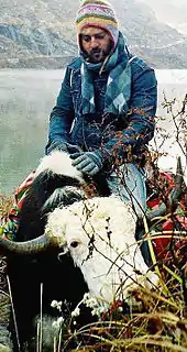 Domesticated yaks have been kept for thousands of years, primarily for their milk, fibre and meat, and as beasts of burden. Their dried droppings are an important fuel, used all over Tibet, and are often the only fuel available on the high treeless Tibetan Plateau. Yaks transport goods across mountain passes for local farmers and traders and are an attraction for climbing and trekking expeditions: "Only one thing makes it hard to use yaks for long journeys in barren regions. They will not eat grain, which could be carried on the journey. They will starve unless they can be brought to a place where there is grass."[20] They also are used to draw ploughs.[21] Yak's milk is often processed to a cheese called chhurpi in Tibetan and Nepali languages, and byaslag in Mongolia. Butter made from yaks' milk is an ingredient of the butter tea that Tibetans consume in large quantities,[22] and is also used in lamps and made into butter sculptures used in religious festivities.[23]
