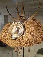 The Yaka are notable for their arts and handicrafts. They make statues, portraits, baskets, carved objects, masks, tools for cooking, building, hunting, fishing or entertaining with additions of instruments such as drums. Their masks are bulky, distinctive with upturned noses and eyes shaped in the form of globules. These masks were frequently used in various Traditional Religion ceremonies.[1] Their sculptures called mbwoolo and their carved slit drum called mukoku are regionally famous and used in ritual dances.[5]