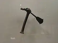 The paramount chief's authority was most signified by coiled rings around his ankle and arm that contain fibers and a sacrificial tendon wrapped in copper called the kazekedi or lukano.[6]: 10 [7]: 39–40 Another great signifier of chiefly rulership is the mbeele phoko, a double sided sword that is sheathed in a phallus shaped wood and hide sheath that embodies the founding ancestor and signifies the chief's role in maintaining order and securing food as well as his powers over life and death. It is only unsheathed in the special occasions of execution and warfare.[6]: 10 [7]: 40 The authority of the nobles was established by tsala, beaded hats form the top of which juts out a cone embellished with a tuft of feathers. Tsala are differentiated by the colors of their feathers. Tsala zi kanaangi, which had white feathers signify a higher rank than tsala zi nduwa, which had red feathers. White feathers could only be worn by lower rank chiefs when their superiors were not present.[8]: 32 The earth chiefs wore woven raffia headpieces called bweni as their symbols of authority.[8]: 32 Bewni commonly had between one and three crests running from the front to the back of the head.[7]: 66 Bweni must be worn throughout day and night as they were communal charms that protected from wicked influences.[6]: 9–10 [8]: 32 These headpieces required the use of a headrest, called musaw or m-baambu, as they were also worn as charms while sleeping.[6]: 10 These headrests were used to support the head just below the ear while one lies on their side. The headrests were carved from a single piece of wood and commonly featured imagery of a leopard, antelope, human, or a house with a pitched roof.[7]: 70 To prevent from wicked influences many Yaka headrests had charms that were either inserted into a premade cavity or attached to them to protect the owner from wicked influences while they slept.[6]: 10