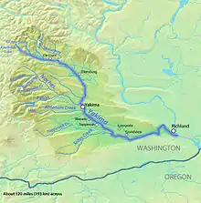 The Yakima River is a tributary of the Columbia River in south central and eastern Washington state, named for the indigenous Yakama people. Lewis and Clark mention in their journals that the Chin-nâm pam (or the Lower Snake River Chamnapam Nation) called the river Tâpe têtt[6] (also rendered Tapteete),[7] possibly from the French tape-tête, meaning "head hit". The length of the river from headwaters to mouth is 214 miles (344 km), with an average drop of 9.85 feet per mile (1.866 m/km). It is the longest river entirely in Washington state.