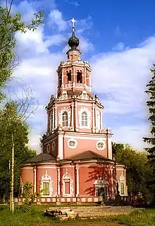 Yakov Grigorievich Bukhvostov (Russian: Яков Григорьевич Бухвостов), a serf of Russian boyar Mikhail Tatishchev, designed the so-called "octagon on cube" churches in the Naryshkin Baroque mode. He was active in the 1690s in Moscow and Ryazan, where he supervised the construction of the new Dormition Cathedral in the kremlin. His tower churches in Ubory and Troitse-Lykovo "may owe something to prototypes in wooden Russian architecture".[1] They are built of brick and decorated with profuse white stone ornamentation. A soaring white tower in front of New Jerusalem Monastery was also built from Bukhvostov's designs. Other buildings attributed to him include the Fili and Zyuzino churches. Some of the attributions are far fetched, since "there is documentary evidence of his being in charge of constructing only a handful of buildings".[2]
