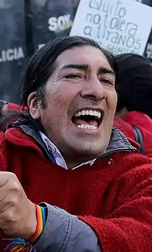 As an activist, Pérez announced his candidacy for the presidency of Ecuador in the 2017 Ecuadorian general election, but lost in the Pachakutik primary election to National Assembly member Lourdes Tibán.[13] He later endorsed the center-right opposition candidate Guillermo Lasso in the run-off election, against Correa's deputy, the PAIS Alliance candidate Lenín Moreno,[14] saying "A banker is preferable to a dictatorship that has deprived us of our territories, that has declared a state of exception, that has locked us in jail".[15]