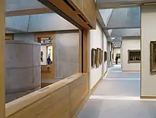 The center was established by a gift from Paul Mellon (Yale College Class of 1929) of his British art collection to Yale in 1966, together with an endowment for operations of the center, and funds for a building to house the artworks. The building was designed by Louis I. Kahn and constructed at the corner of York and Chapel Streets in New Haven, across the street from one of Kahn's earliest buildings,[3] the Yale University Art Gallery, built in 1953. The Yale Center for British Art was completed after Kahn's death in 1974, and opened to the public on April 15, 1977. The exterior is made of matte steel and reflective glass; the interior is made of travertine marble, white oak, and Belgian linen. Kahn succeeded in creating intimate galleries where one can view objects in diffused natural light. He wanted to allow in as much daylight as possible, with artificial illumination used only on dark days or in the evening. The building's design, materials, and sky-lit rooms combine to provide an environment for the works of art that is simple and dignified.[4]
