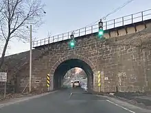 The Yalesville Underpass is a 30-degree skew arch bridge[1] carrying the railroad over Route 150 and Route 71 in Wallingford, Connecticut. Built in 1838 for the Hartford and New Haven Railroad by William MacKenzie, it is reported to be the first skew underpass in America.[2] The arch was designed to allowed tall hay wagons to pass through but it is not wide enough for modern two-way traffic, the one-way traffic being controlled by a pair of lights. Due to the age of the bridge, it has to undergo repairs on a regular basis.