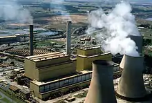 The Yallourn railway line was opened to the town in January 1922 as a branch junctioning at Hernes Oak on the main Gippsland railway; this line was replaced by a one on an easier gradient extending east from Moe in September 1953, which was electrified in 1955.[3] The local railway station closed to passengers in the 1960s,[4] with the line then being used primarily to haul briquettes from the Yallourn briquette factory. When the factory closed, the line was used to haul briquettes from the Morwell factory to Yallourn, as briquettes were used as the initial fuel when lighting the furnaces in the power station until enough steam was generated to dry the brown coal used as the main fuel. Closure of the line occurred in 1986 when the transport of briquettes shifted to trucks.[5]