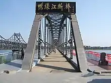 The Yalu River Broken Bridge (simplified Chinese: 鸭绿江断桥; traditional Chinese: 鴨綠江斷橋; pinyin: Yālù Jiāng Duàn Qiáo) is a truncated railway swing bridge converted to a viewing platform and historical site. Constructed in 1911 by the Empire of Japan, it was the first bridge built across the Yalu River and connected the Chinese city of Dandong with the Korean city of Sinuiju, linking Japanese-ruled Korea to the Eurasian rail network. The bridge originally consisted of twelve truss spans supported by stone foundations in the riverbed. During the Korean War, the eight spans over the Korean side of the river were badly damaged by American bombing, and were subsequently dismantled. The bridge was not rebuilt. Instead, the remaining four spans over the Chinese side of the river were converted to a walkway, a viewing platform, and a historical site.