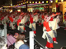 The Yamagata Hanagasa Matsuri is an annual summer festival that lasts from 5 August to 7 August on Friday, Saturday, and Sunday during the first weekend of August. It was first celebrated in 1963 when the parade was a part of the Zaō Summer Festival as an event to attract tourists to Yamagata Prefecture. After some success the parade grew over time into one of the four major festivals of the Tōhoku region.[1] Ten thousand dancers dance to the "Hanagasa Ondo" song in the parade.[2]