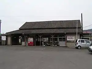 The station consists of a side and an island platform serving three tracks at grade with two sidings branching off track 1. The station building is an old timber structure of traditional Japanese design with a double tiled roof. It is unstaffed and serves only to house a waiting room and an automatic ticket vending machine. Access to the island platform is by means of a level crossing with steps.[2][3][4]