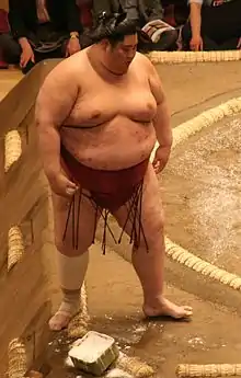 Ryūichi Yamamoto (山本 龍一, Yamamoto Ryūichi, born May 8, 1984), known by his shikona Yamamotoyama Ryūta (山本山 龍太), or simply Yama,[1] is a Japanese retired sumo wrestler from the city of Saitama in Saitama Prefecture. He made his professional debut in January 2007, and reached the top makuuchi division in January 2009. His highest rank was maegashira 9. At 265 kg (584 lb), Yamamotoyama is the heaviest Japanese-born sumo wrestler in history,[2] and is also thought to be the heaviest Japanese person ever.[1] In April 2011, he was told to retire by the Japan Sumo Association after he and several other wrestlers were found to be involved in match-fixing. He currently resides in Los Angeles and participates in sumo exhibitions and amateur tournaments, and has made a number of appearances in television shows, commercials and music videos.
