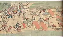 In response to these developments, villages began to exert more independence and organize themselves in so-called ikki.[15] There existed different types of ikki,[16] but at their core ikki were parties formed to achieve a common goal, often mutual protection. In this regard, they stood in marked contrast to vassalage relationships,[9] and could include members from different social classes who cooperated on equal footing.[11] An ikki was formed after a group had discussed, written, signed, and ritually celebrated an agreement, thus binding the group members to the agreement's rules.[9] In the early 15th century, ikki began to organize a growing number of protests, often aimed at the cancellation of peasant debts. These protests often turned into violent riots during which ikki members attacked moneylenders, destroyed debt ledgers, burnt public buildings, and looted.[16] Yamashiro Province became especially affected by ikki, with protesting and rioting peasants repeatedly occupying parts of Kyoto.[17] As a result of their association with violence, ikki came to mean both "league" as well as "uprising".[18]