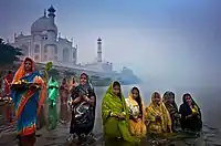 ![]() Devotees offer prayer in the river Yamuna beside Taj Mahal | |