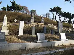 Yanghwajin Foreign Missionary Cemetery (Korean: 양화진외국인선교사묘원), also known as the Hapjeong-dong (합정동) International Cemetery, is a cemetery overlooking the Han River in the district of Mapo-gu, Seoul, South Korea. Designated in 1890 as a site for foreign missionaries by King Gojong, the site is currently open to the public from 9:00am to 6:00pm and is located next to Jeoldusan Martyr's Shrine. It is estimated that approximately 30,000 Koreans and 500 foreign nationals visit every year.