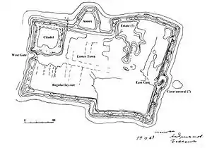Since 2011, a team from Moscow State University has applied several non-destructive survey techniques to large parts of the site.[11] The results show that the citadel interior was probably located on a natural elevation. There was a regular lay-out and dense arrangement of buildings across much of the western half of the interior, in contrast to larger building complexes ('estates') in a loose arrangement in the eastern half. The annexe attached to the northern town wall proved to be completely empty. In 2019, a Moscow geomorphology-pedology team carried out mechanical coring on a grid across the site. Preliminary results include deep stratification of cultural layers several metres down found in most cores; the large regular feature on the inside of the northern wall is not an 'estate' (as originally thought), but a massive clay platform; and the substantial structure outside the east gate, hypothesized to be the remains of a caravanserai, are a natural island in a (now dry) river bed dating to before the beginnings of settlement at Dzhankent.