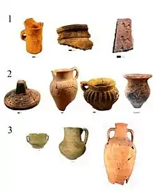 At the junction of the citadel wall and northern town wall (Trench P2), occupation layers with complex stratification were found by the Russian-Kazakh-German team down to a depth of more than 8 metres (26 ft) from the current top of the citadel wall.[6] Radiocarbon dates from this trench produced a range of (cal.) AD 786/923 to 961/1095.[7] The extension of the trench at the top of the citadel wall since 2012 has uncovered semi-circular towers on the wall. In 2019, a 9th/10th century pottery vessel from the outside of the northern base of the citadel wall was found to contain three eggs with Arabic writing on them.