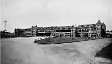 Yangon Central railway station was first built in 1877 by the British to support Burma's first railway line, from Yangon to Pyay. The station was located on the southern side of the railway compound on the upper block of Phayre Street (now Pansodan Street) in the downtown area. The building was designed in the British Victorian style and the access roads were bordered by grassy lawns. The beauty of the property prompted locals to praise the new structure as the Fairy Station.[3] The station became a favorite target for Japanese bombers during World War II. In 1943 it was destroyed by British forces retreating to India.[3]