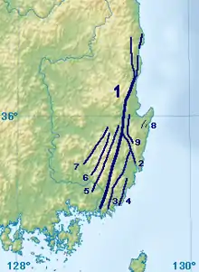 Yangsan Fault is a seismic fault in southeastern Korea[1][2][3][4][5] which was responsible for the 5.7 Mw Gyeongju earthquake in 2016. It is located between Yeongdeok County and Busan with Yangsan.