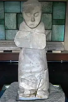 Statue of man holding shield from an Eastern Han dynasty tomb discovered in the river bed of the Yongding River in Fengtai District to the west of Ji.