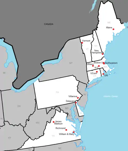 For the first half of its history, the Yankee Conference consisted of the flagship public universities of the six New England states. Conference expansion in the 1980s and 1990s added several colleges and universities from the Mid-Atlantic region.
