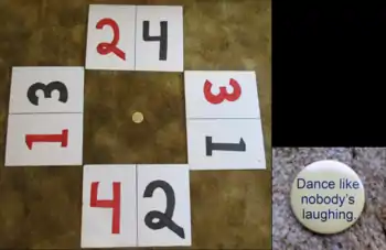 The square of 16 dancers comprises 4 pairs of couples, facing each other, in the corners of the square. These pairs of "neighbors" will remain together throughout the dance, except for temporary departures and returns... always to the original corner of the square. The dance has four major parts, which are all identical, except for the orientation of the paired couples, which changes by 90° from one part to the next. Each major part has two minor parts. In the first minor part, the four neighbors interact with either of the two adjacent corner foursomes, which alternates from one orientation to the next. In the second minor part, the diagonally opposite members of each foursome interact only with the similarly-positioned members of the other foursomes. Effectively, the square can be described as two "teams" of eight, doing very different things in the same shared space. Each team also divides into 2 groups of four. Four members of the "X team" traverse one of the diagonals of the square (from which the name Dutch Crossing derives[3]), across and back. The other four members traverse the other diagonal. The groups interact with each other in the middle and with members of the "O team" at the corners. Simultaneously, eight members of the "O team" perform a grand right and left around the circumference of the square. The role of each dancer alternates between "X team" and "O team" as the major parts cycle through the four orientations. Understandably, it is not uncommon for a square to disintegrate before all four major parts are completed. But that is part of the dance's appeal.