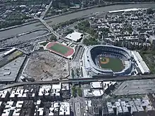 Groundbreaking ceremonies for the stadium took place on August 16, 2006, the 58th anniversary of Babe Ruth's death, with Steinbrenner, Bloomberg, and then-Governor of New York George Pataki among the notables donning Yankees hard hats and wielding ceremonial shovels to mark the occasion.[31][32] The Yankees continued to play in the previous Yankee Stadium during the 2007 and 2008 seasons while their new home stadium was built across the street. The community was left without parkland for five years.
