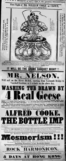 Cooke's Royal Circus was in Great Yarmouth, and as part of a promotion, it was advertised that a clown, named Arthur Nelson, would sail up the River Bure in a washtub pulled by four geese on 2 May 1845.[7][8] The trick, first devised by Dicky Usher in 1809, was achieved by having the tub attached to a rowboat by an underwater line.[9][10] A large crowd assembled in the vicinity from around 5 pm to view the feat which started with the flood tide.[7] Several thousand people viewed the clown from the river banks and at least 300 in a crowd 4–5 deep on the southern footway of the bridge.[5][8] The crowd concentrated at the south-eastern corner of the bridge, though the bridge was far from full as the carriageway was still passable to carts.[11][6]