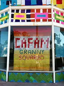 YBLA’s largest endeavor to date is CAFAM Granny Squared,[21] a self-produced grassroots project that brought together an international community of over 500 artists and crafters to cover the façade of the Craft and Folk Art Museum with granny squares to make a statement about artistic and institutional identities.[22] CAFAM Granny Squared was installed in May 2013 and dismantled in September 2013. Leftover contributions were assembled into blankets as part of a collaboration with the Downtown Women's Center.[23] Christopher Knight, art critic at the Los Angeles Times, referred to the installation as "wonderfully weird," "jarringly playful," and "disconcertingly fuzzy," while placing it into a context with Minimalist repetition and Bauhaus textile arts.[24]