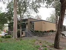 The library complex was officially opened on 22 May 1994. It was designed by Melbourne architect Greg Burgess and won the Royal Australian Institute of Architects' Institutional Architecture Award in 1995.[40] The setback, height of walls and the roof, materials and colours were chosen to complement its natural setting. 14,100 mudbricks were made locally for the building.[41] An extensive re-modelling and renovation took place in 2010, adding more space with the removal of the large circulation desk turning this into a reading corner, adding more computers.[42] A new children's courtyard was also established at that time, designed by Jeavons Landscape Architects in collaboration with Greg Burgess Architects.[43]