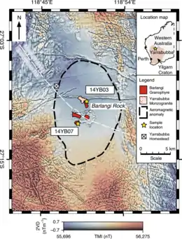 ![]() Composite aeromagnetic anomaly map of the Yarrabubba impact structure[1] | |