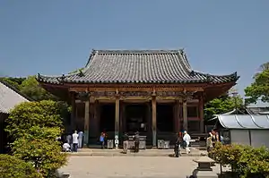 Yashima-ji (屋島寺) is a Shingon temple in Yashima, a lava plateau to the northeast of Takamatsu, Kagawa Prefecture, Japan. A branch temple of Ninna-ji in Kyoto, it is the eighty-fourth temple on the Shikoku 88 temple pilgrimage.[1] It is said to have been founded as a Ritsu school temple by Ganjin in 754, and to have been converted by Kōbō Daishi.[2][3] The 5x5 bay irimoya-zukuri tiled Hondō (1618) has been designated an Important Cultural Property.[4][5] A Heian period wooden seated statue of Senjū Kannon and the temple bell (1223) are also Important Cultural Properties.[6][7][8][9] There is a museum of temple treasures and items relating to the Battle of Yashima.[2]
