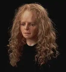The Yde Girl was put on display and further study was not carried out on the remains until 1992. Richard Neave, of University of Manchester, took a CT scan of the skull of Yde Girl and determined her age, both anatomically and historically.[3][4][6] The Yde Girl became internationally known when Neave made a reconstruction of her head, using techniques from plastic surgery and criminal pathology.[7] Due to the state of the body, the work on the reconstruction included some guesswork, for example, the nose and some other facial features.[2] Yde Girl and her modern reconstruction are displayed at the Drents Museum in Assen.