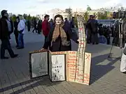 Osipova is known for participation in virtually all protest rallies with placards denouncing injustice and crime, warning of danger, and sympathizing with someone's distress, be it natural disasters or violations of political freedoms.[11] She tried to attract public attention to Beslan school siege, Iraq War, November 2015 Paris attacks, Bolotnaya Square case, Annexation of Crimea by the Russian Federation, War in Donbas. She honoured memory of Boris Nemtsov.[10][14] For some time, she was detained at every rally, but then brought home by the police officers.[4][16] For her active civic stance, the artist has come to be referred to as "The Conscience of St. Petersburg".[10][16]