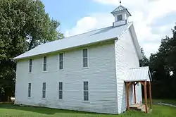 The Yell Masonic Lodge Hall is a historic Masonic lodge on the west side of United States Route 412 in Carrollton, Arkansas. Also known as Carrollton Masonic Lodge, it is a two-story wood-frame structure measuring about 50 by 35 feet with a front-gable roof, clapboard siding, and a stone foundation. A small belfry rises above the roof, capped by a pyramidal roof. The building was built in 1876, originally serving as a church on the ground floor, and a Masonic meeting hall for Yell Lodge #64 on the second.[2] The building was a major community center for Carrollton, which was the first county seat of Carroll County but declined in importance after it was bypassed by the railroads.[3]