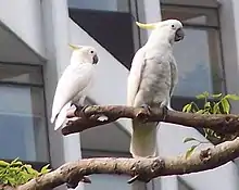 An introduced population of these birds is found in Hong Kong.[18] They are a common sight across the densely populated area on both sides of the harbour, easily spotted in the woods and public parks in the north and west of Hong Kong Island. The large group has apparently developed from a number of caged birds that have been released into the Hong Kong area over many years.[19] An often repeated story is that Hong Kong Governor Sir Mark Aitchison Young released the Government House's entire bird collection – including a large number of yellow-crested cockatoos – hours before surrendering Hong Kong to Japanese troops in December 1941.[20] Historians and conservation biologists in Hong Kong have found no evidence to corroborate this story, and believe that Hong Kong's yellow-crested cockatoo population is made up of escaped pets. The earliest record of an escaped yellow-crested cockatoo pet comes from 1959.[21]