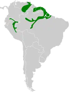 Yellow-crowned elaenia is found in the Amazon Basin along the major river course of the Amazon, also the outlet of the adjacent Tocantins River, then after an interruption in the range along the Amazon River, it is along Amazon drainages from eastern Peru, and Ecuador along the river corridors. It also ranges northeastwards into the Guyanas, avoiding the Guiana Shield, from the Amazon River outlet to the Atlantic. The other disjunct population of the species is to the northwest on the eastern portion of the Orinoco River drainage, going from Venezuela into the extreme northeast Colombia border region.