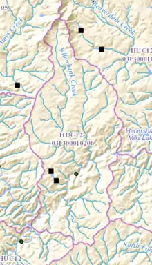The creek watershed and associated waters is designated by the United States Geological Survey as sub-watershed HUC 031300010206, is named the Lower Soque River sub-watershed, and drains an area of approximately 15 square miles west of Clarkesville and northwest of Demorest, as well as northwest of the Soque River.[3]