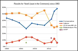 From 1918 until 1983, Yeovil always returned a Conservative MP (though by only narrow margins over Labour in the 1940s and 1950s). There then followed a period of over 30 years during which the seat was represented by a member of the Liberal Party or their successors, the Liberal Democrats; firstly former leader Paddy Ashdown (1983–2001) and then former Chief Secretary to the Treasury David Laws (2001 to 2015).[3] At the 2015 election, the seat returned to its former Conservative allegiance as Marcus Fysh defeated Laws by over 5,000 votes.[4]